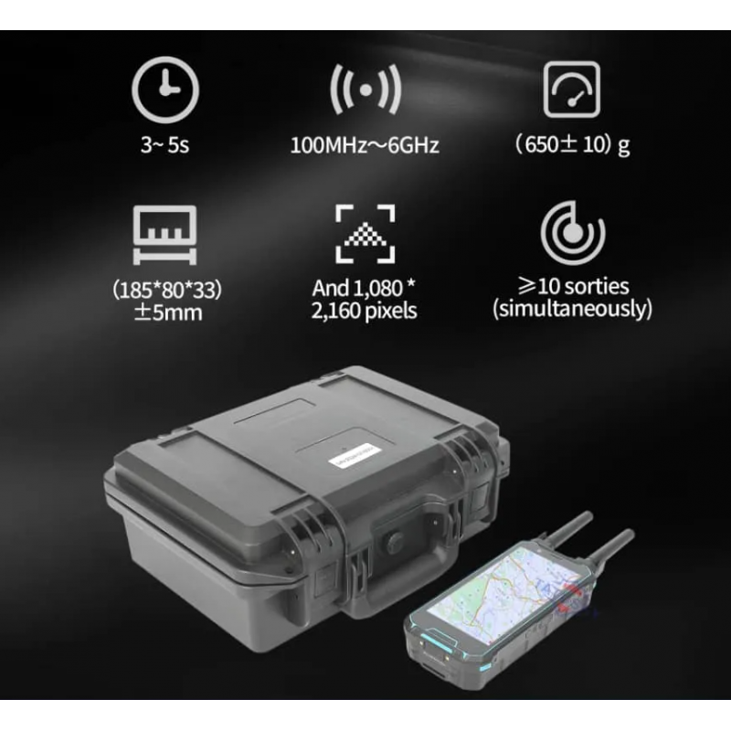 Pensé pour une utilisation terrain intensive, ce détecteur UAV est léger, ergonomique et simple à déployer. Son écran tactile 6 pouces haute résolution assure une lecture claire des informations, tandis que sa batterie lithium intégrée garantit plusieurs heures d’opération continue. C’est l’outil idéal pour les équipes mobiles, forces de l’ordre et agents de sécurité.