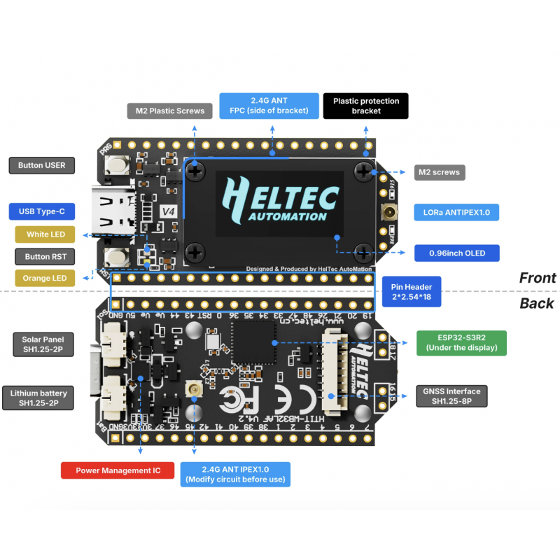 Paramètres V3.0 Version 4 Microcontrôleur ESP32-S3FN8 ESP32-S3R2 Flash (mémoire) 8 Mo (intégrée) 16 Mo (externe) Puce USB vers série CP2102 Suppression du CP2102 Gestion de l’énergie Circuit intégré Li-ion standard CI amélioré avec entrée solaire Entrée solaire Non disponible Interface SH1.25-2P ajoutée Puissance d’émission LoRa 21 ± 1 dBm 28 ± 1 dBm Antenne 2,4 GHz Antenne à ressort métallique Antenne FPC + connecteur IPEX Interface GPS Non disponible Interface SH1.25-8Pin ajoutée Interface périphérique 36 broches 40 broches Connexion écran Soudé Connecteur B2B soudé Finition des broches Plaqué argent Plaqué or Support écran Protection partielle Protection complète -